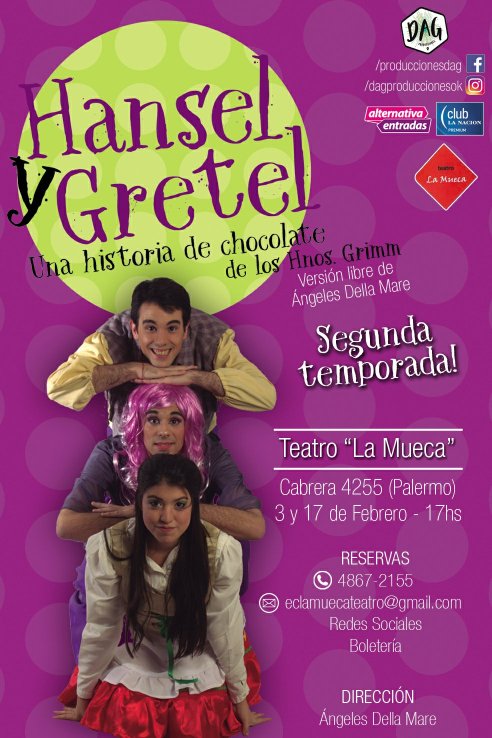 Hansel y Gretel es una obra de Dag producciones , que ha llevado el espectáculo a distintos teatros de CABA y el Gran Buenos Aires , actualmente contando con funciones en el teatro La Mueca. Se trata de una opción para llevar a los más chicos y entretenerse con teatro para toda la familia.
