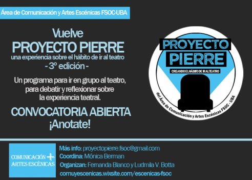 Proyecto Pierre es una experiencia que indaga sobre el hábito de ir al teatro. Primero lanzamos una convocatoria invitando a estudiantes de nivel superior (terciario, universitario y de posgrado) y a docentes. Luego armamos una programación de obras pensando en un público potencial del teatro, aquél que tiene cierta curiosidad por este consumo cultural pero que asiste a ver obras de forma ocasional. Vamos a ver una obra por mes, buscando generar un recorrido que dé cuenta de la oferta teatral de la ciudad. Algunos focos dentro de la construcción de este hábito tienen que ver con trabajar sobre mitos como que el teatro es caro, el teatro es solo aquél conocido como comercial o «de calle Corrientes», que el teatro es solemne, aburrido o que no es para todos. La Ciudad de Buenos Aires tiene teatro para diversos tipos de espectadores y tratamos de que cada miembro de Proyecto Pierre pueda ir descubriendo qué le gusta y qué no dentro de la amplia oferta. Para esto siempre contextualizamos las obras, hablamos del circuito en el que se mueven, del teatro en el que se representan y de su compañía. Otro foco está en que las entradas siempre son pagas porque parte de la construcción del hábito tiene que ver también con valorar el trabajo artístico como un trabajo rentado. El pago de la entrada además, se asocia a un compromiso de asistencia, por eso las entradas se compran por anticipado al valor que estipule la compañía, que suele realizar un descuento de estudiantes. Por último, como el teatro es intercambio, es encontrarse con pares, reflexionar y debatir, al finalizar la función siempre ofrecemos un pequeño debate que podría asemejarse a una charla de café, que no pretende ser pedagógica sino más bien de intercambio de opiniones para que cada asistente comparta con el grupo lo que la obra le generó.