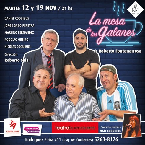 En el teatro Buenos Aires, antes de salir de gira, aqui en Rodríguez Peña casi Corrientes, en dos únicas funciones, 12 y 19 de noviembre, dos martes consecutivos, a las 21 hs, la obra: La mesa de los galanes.
