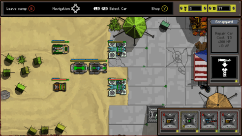 Bien, antes de describir el gameplay, si nunca jugaste o escuchaste lo que es un Roguelike, básicamente es un tipo de juego en los que cuando mueres, pierdes todo el proceso (sí, así como lo leíste, aunque no es tan malo como suena), incluidas las armas y mejoras, y vuelves al inicio del juego, eso es a grandes (muy grandes) rasgos un Roguelike, y es lo que nos encontramos en Convoy, la diferencia más clara es que es un juego muy táctico, otra cosa muy interesante es que las partes que debamos recoger cambian de ubicación cada vez que nos destruyan y empecemos de vuelta, aparte de todo esto, hay una cantidad limitada de combustible con lo cual debemos tener cuidado siempre, también para movernos debemos elegir el punto de llegada en un mapa, y aunque lo más sencillo parezca ir en linea recta para ahorrar combustible, no lo es del todo, puesto que el camino no es siempre igual, hay diferentes tipos de terreno todo el tiempo, lo cual afecta la velocidad de los vehículos y el consumo del combustible, y si nos quedásemos sin combustible debemos recurrir a pedir ayuda, mientras esa ayuda tarde en llegar quedaremos totalmente expuestos e indefensos. Los combates tienen vista cenital y se llevan a cabo durante la marcha de los vehículos, el vehículo de carga (el más grande) mantiene una trayectoria fija mientras que los autos escolta pueden moverse alrededor del mismo, y son quienes portan las armas de corto y largo alcance que utilizaremos para acabar con los enemigos, en cuanto al vehículo de carga, el mismo cuenta con habilidades (que tienen un tiempo de carga una vez que sean utilizados) como por ejemplo paralizar a los enemigos para hacerlos chocar contra los obstáculos del camino, dado el caso que nos quedemos sin escoltas y nuestro carguero aún tenga sólo la habilidad básica, sólo nos quedan dos opciones: esperar a que nos destruyan o reiniciar manualmente la partida. La tienda donde podemos comprar tanto armas como también vehículos y mejoras, es tan útil como sorprendente, porque (como es muy característico también en este tipo de juegos) los objetos cambian cada vez que visitemos la tienda, lo cual lo deja todo a la suerte.