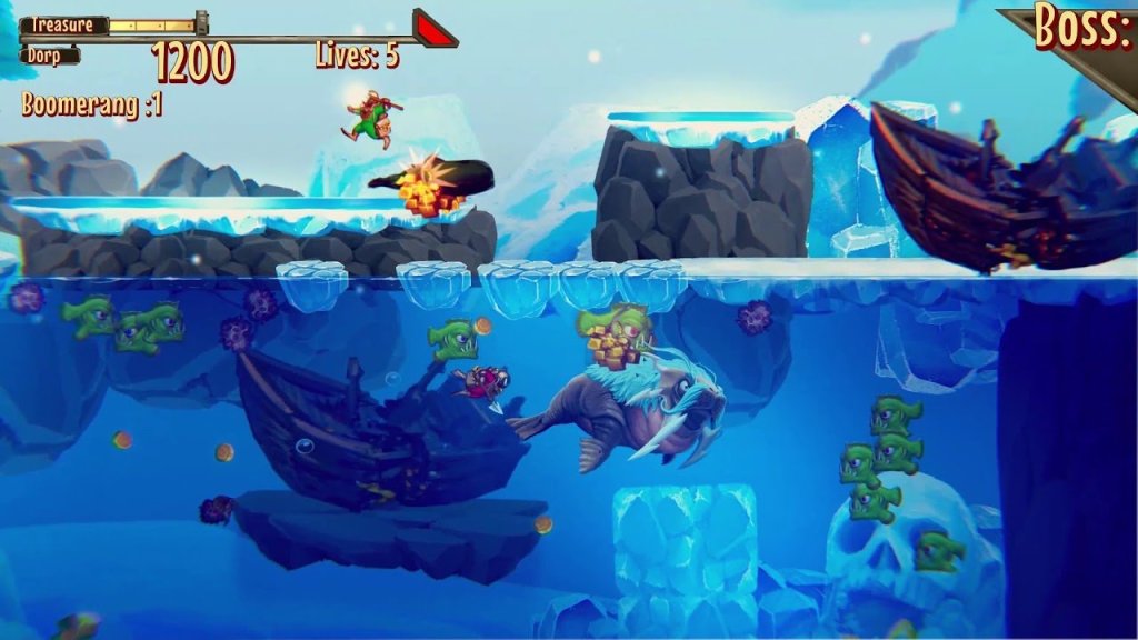 Recorre los diferentes desafíos que plantea la isla, explora diferentes niveles y escenarios. Si bien el juego plantea hasta en su portada principal un mundo acuático, un personaje principal como un buzo y la idea de inmersión, pasarás por una variedad de fondos como por ejemplo un desierto, donde te atacarán tortugas lanza llamas, deberás trepar por escaleras y romper rocas con tu lanza pero siempre con el mismo objetivo de superar el level hasta llegar al puntaje solicitado.
