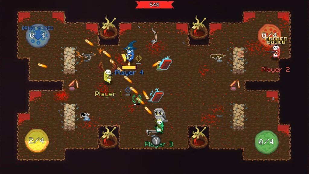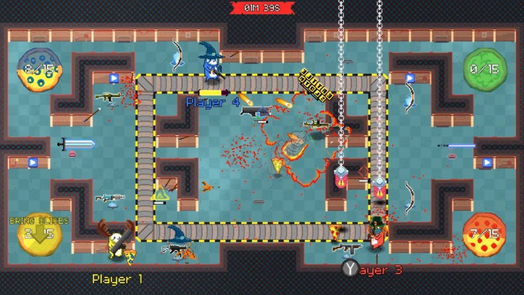 Bajo la premisa de una civilización de perezosos que pelean por la pizza comienza este título. Los lotes de batalla están concentrados para el juego en multijugador, aunque está la posibilidad del juego en solitario. Tenemos cuatro modos distintos para el multijugador, primero tenemos al Slice Hunt, dónde se debe traer las pizzas que los perezosos dejan caer en su base. En Golden Slice debemos recuperar una porción de pizza que se aloja en una ubicación aleatoria y debemos evitar que la maten. Sloth Hunt, es una partida donde gana el jugador con un número determinado de muertes. Otro de los atractivos del juego son sus sombreros, si bien la jugabilidad puede resultar un tanto repetitiva, las victorias nos hará poder conseguir distintos sombreros que serán parte de la personalización de los protagonistas. El combate es rápido e intenso, por lo que nos deja un entretenimiento que es seguro, pero que se disfruta más si lo compartes con otras personas. También contamos con variedad en las armas, en las que cada una cuenta con características particulares para utilizar en combate, si bien no son tantas las armas en cantidad, pero si sus características son diferenciables. Este armamento puede conseguirse también en batalla, por lo que puedes cambiarlas rápidamente si te estás quedando sin munición. El modo solitario está más bien hecho para familiarizarse con las mecánicas del juego, funciona mucho más el modo de fiesta en el que puedes compartir hasta con cuatro jugadores, lo más entretenido del juego.