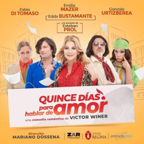 15 días para hablar de amor es una comedia amena, tierna y llena de color que se presenta en el Teatro Regina los viernes y sábados a las 21:30 y domingos a las 19:30 (Av. Santa Fe 1235)