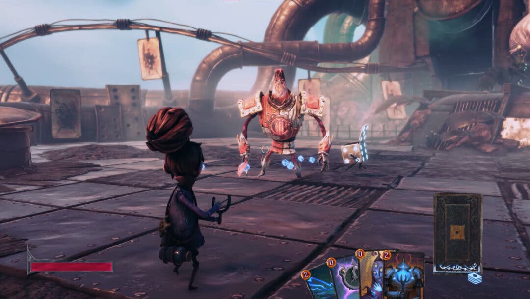 Pero las particularidades no terminan ahí; ya que, para poder avanzar en el juego, tendremos que ir formando un maso de cartas que será clave en varios momentos, así como también, deberemos aprender las reglas de un juego de dados; llevando al máximo el espíritu de ludopatía que nos presenta Lost in random. Aunque si vale aclarar que una vez que le agarramos el chiste a esta mecánica, puede tornarse bastante monótona.