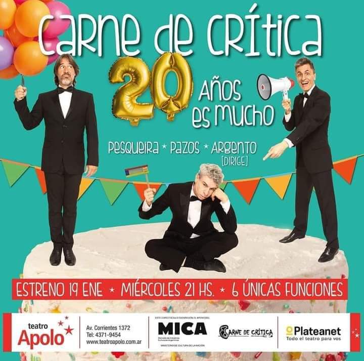 »»Hagas lo que hagas serás criticado, pues entonces haz lo que quieras pues todos somos carne de crítica». Así nació nuestro primer espectáculo que hoy reestrenamos para ustedes: «Carne de Crítica…un espectáculo de humor crítico. Pasaron 20 años y la realidad nos encuentra en un contexto similar, nuevamente post «catástrofe» y con temáticas que a pesar del tiempo nos siguen interpelando.Tomando como eje la crítica, en sus diferentes manifestaciones, se hilvanan las distintas escenas de este varieté». Así define Carlo Argento su obra.