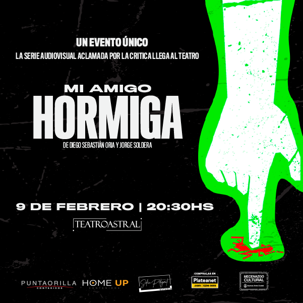 El próximo miércoles 9 de febrero, en una función única y exclusiva, sube al escenario del Teatro Astral el éxito audiovisual “Mi Amigo Hormiga”, con el protagónico de Thomas Lepera, Mora Fisz, Agus Benavides, Adrián Altamirano, Nora Pavón, Paula Rosen, Sebastián Fernández y la participación especial de Diego Sassi.