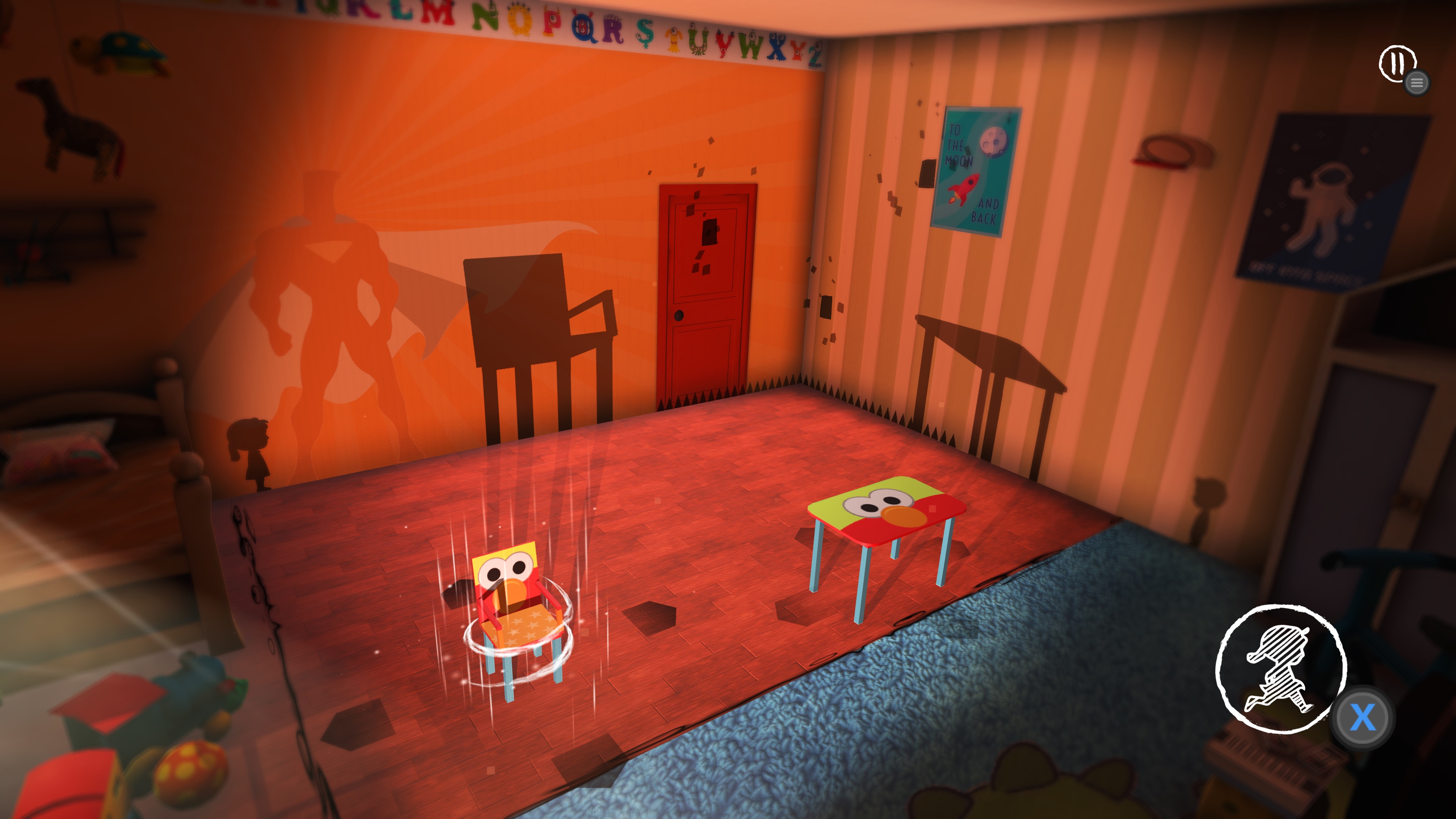 Recogiendo las páginas de nuestros recuerdos Mientras juegas In My Shadow , se da forma a una historia que te da una idea del pasado de nuestra joven protagonista. Cada conjunto de niveles se centra en una habitación en particular de la casa de su infancia y como resultado, se centra en un miembro en concreto de su familia. Para completar estos niveles, no solo debes llegar a las personas que te esperan al otro lado de cada nivel, sino que también debes recolectar unas páginas de recuerdos ubicadas estratégicamente en cada etapa. Para ser claros, estas páginas no son un coleccionable que puedas elegir si reunir o no. Si llegas al final de un nivel sin haber recopilado todas estas páginas, no podrás avanzar. Esto hace que algunos de los niveles de In My Shadow sean más complejos y difíciles de entender, ya que algunas páginas pueden estar flotando sobre pinchos peligrosos o estar en algún que otro lugar completamente apartado en el que tienes que construir tu sombra y al mismo tiempo dejar paso para cruzar al otro lado de la pantalla.