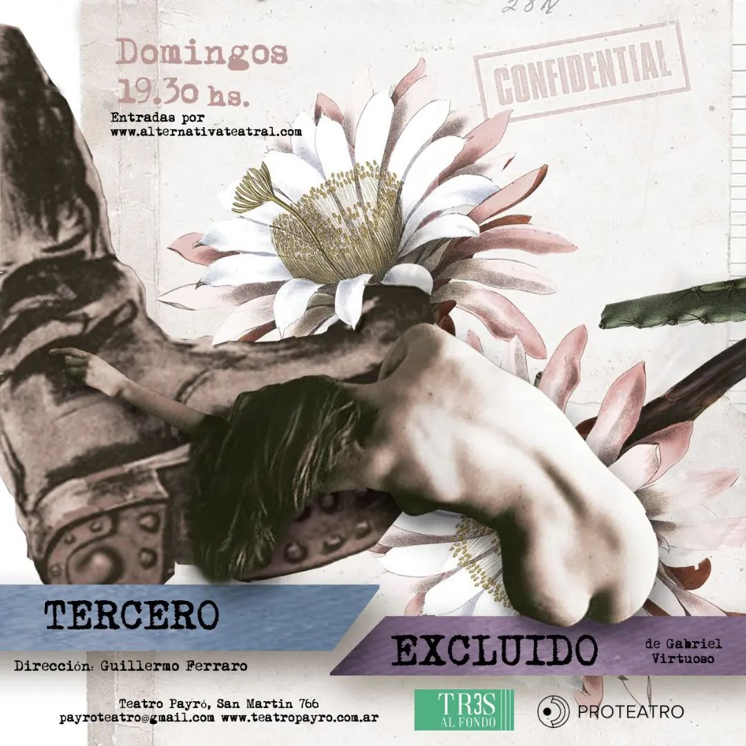 Con este episodio en off, comienza Tercero excluido, la obra del dramaturgo, actor, director y productor Gabriel Virtuoso, recientemente fallecido, integrante, además, de la Compañía de Teatro Clásico de Santiago Doria. En el contexto de esta “ilustre” visita, el jefe de un destacamento de un pueblo sin importancia de la provincia, el Teniente Chacho, fantasea con la visita del dictador. Se trata de un lugar en el que mucho no pasa, que tiene sus habitantes notables (la ricachona señora Martínez, moralista, aunque no zonza; las chicas del prostíbulo, otro milico), las fuerzas vivas de la comunidad, el diario local…, por eso se espera que este acontecimiento los saque de la modorra pueblerina y que le permita al Teniente Chacho alcanzar mejor fama. Ese tercero Jefe del Ejército Argentino tiene la llave para abrir otras aspiraciones, por lo menos, dos: una es la de la esposa de Chacho, quien espera con desesperación que su marido termine con una prolongada abstinencia sexual debido a los “nervios” que le causa la ilustre visita; la otra es la del propio Chacho, que ansía la llegada redentora del Teniente General.