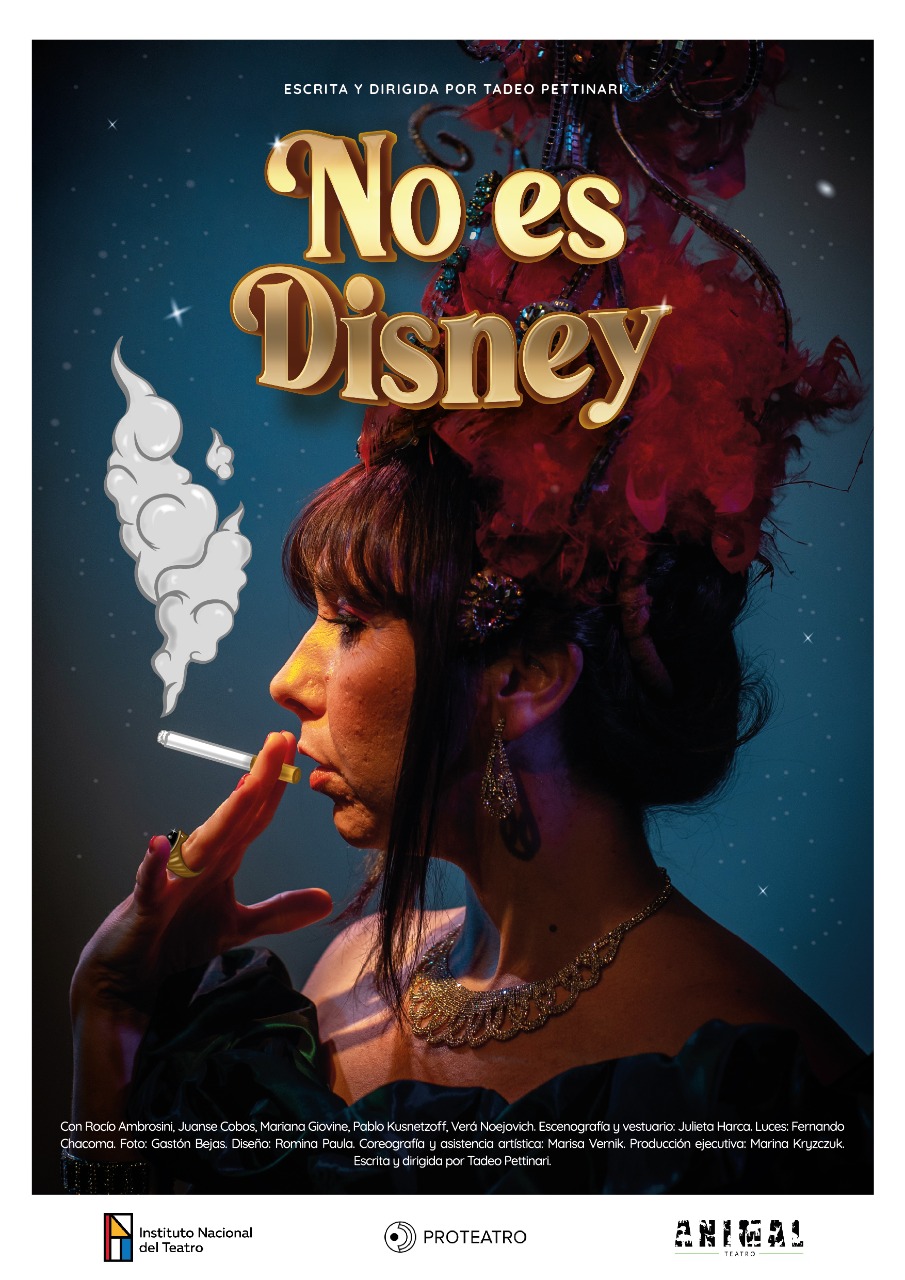 Un evento desafortunado sacude a la familia y la coloca en un limbo de incertidumbre, forzando a los personajes a cuestionar sus más profundos caracteres, a interpelarse de manera profunda y sensible. En búsquedas de algo que los sostenga y los encamine hacia un sentido, los roces de los personajes, que parecen deambular en el espacio sin poder encontrarse entre sí, poseen un tinte cómico y fogoso que ridiculiza al extremo la obra y la vuelve puramente humana. Fuera de todo relato solemne, “No es Disney” trabaja la pobreza y la incertidumbre en una realidad donde el rumbo está todo menos señalizado, donde las oportunidades escasean y la rutina se convierte en una monotonía interminable. Con instantes musicales y oníricos, Florencia viaja constantemente al pasado para revisitar una vida que abandonó cuando conoció a su marido, mientras su hijo Iván -interpretado por Juanse Cobo- anhela viajar al extranjero para estudiar música y su hija Andreina -interpretada por Vera Noejovich- se refugia en la literatura y la intelectualidad para construirse un caparazón de la situación que la rodea.