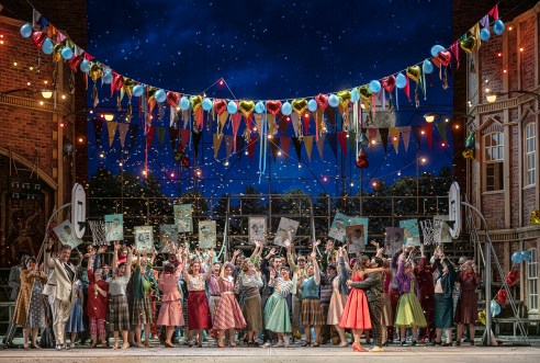 Enrique Bordolini es el argentino creador de este alucinante escenario. Sus referencias pueden ser alguna escena del musical West Side Story (1961), pero también algún barrio de inmigrantes en la década de los 50. Recrea una cancha de basket en un vecindario amigable. Paredes de ladrillo, rejas y gradas son los elementos de su escenario, todo esto es acompañado junto al multicolor vestuario de Renata Schussheim, la cual remite a aquellos coloridos musicales de la época dorada de Hollywood.