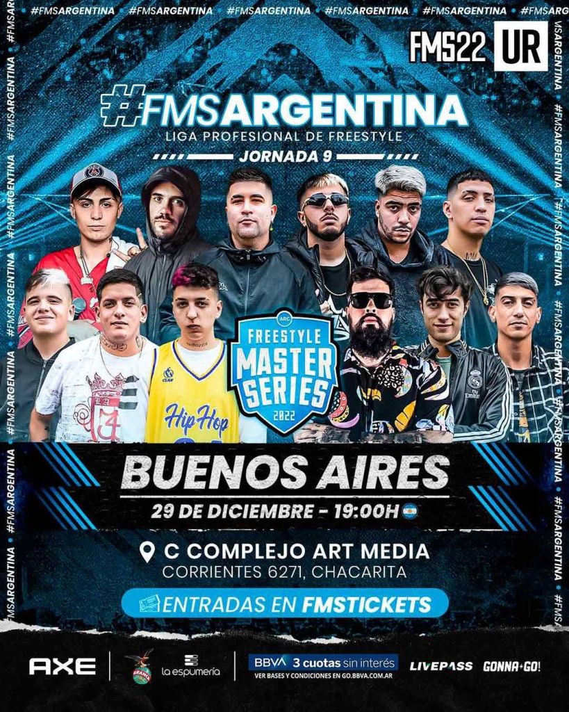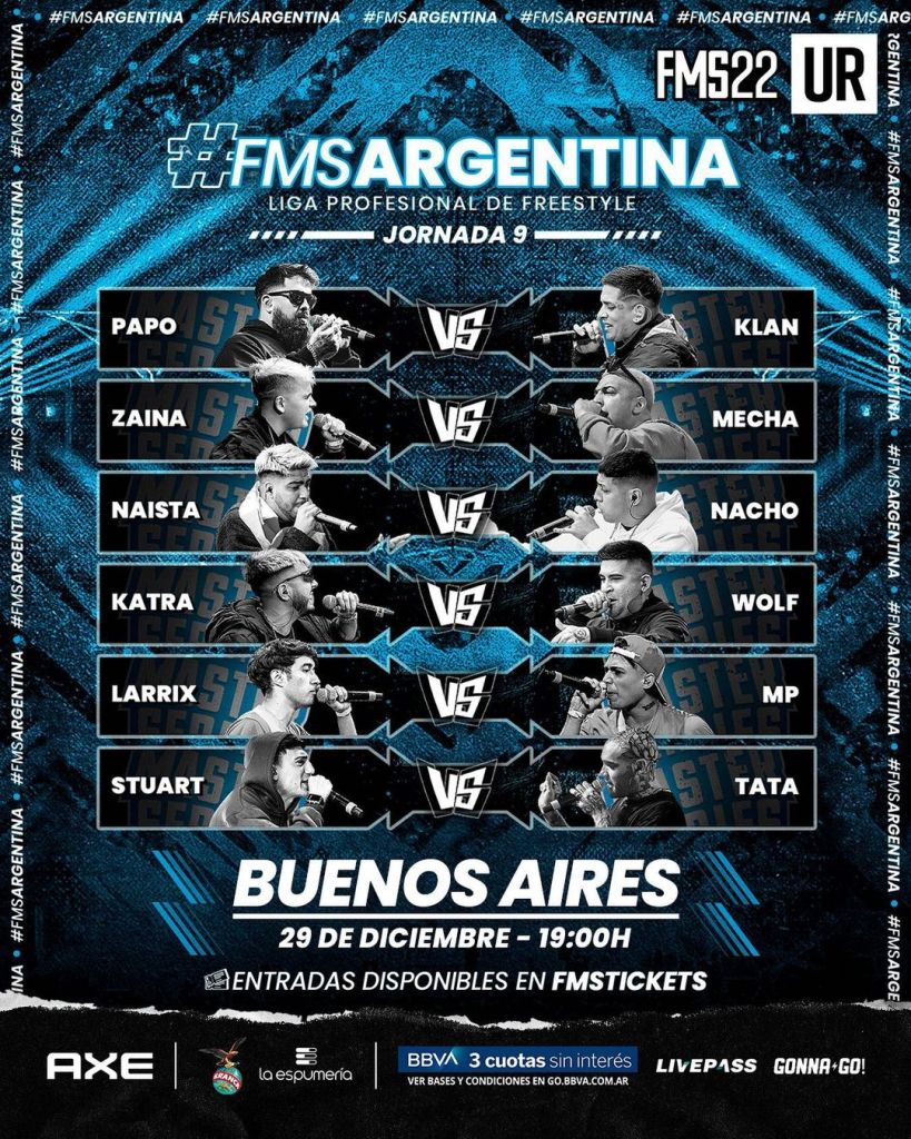 Buenos Aires ya tiene a la venta sus entradas, por lo que no te podés perder la oportunidad de ver a: Papo, Larrix, Mecha, Klan, Zaina, Stuart, Wolf, Katra, Nacho, MP, Naista y Tata. La liga del flow y la diversidad de estilos vuelve para encarar sus tres últimas fechas y con el segundo corte de FMS Internacional en el horizonte.