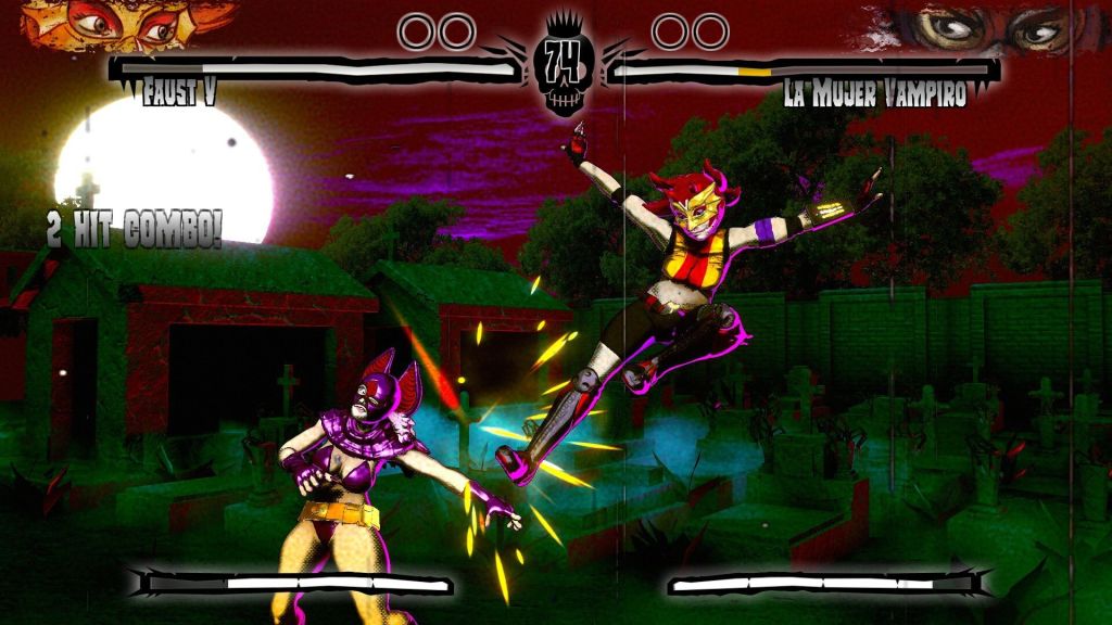 alza como una propuesta fresca y, sin duda, peculiar dentro del género de lucha. Este título independiente de un estudio mexicano logra cautivar con un diseño artístico y musical que destaca, creando una atmósfera tan bizarra como sus mismos personajes. La banda sonora, con temas que van desde el horror de las momias hasta la energía de un ring de combate, se queda grabada, complementando unos efectos de sonido que, en su mayoría, realzan la efectividad de los golpes. Sin embargo, no todo es perfecto en el apartado sonoro; la repetición de ciertos efectos en combos, como el de Evangeline con su ruido saturado, puede volverse un poco tediosa y desesperante.