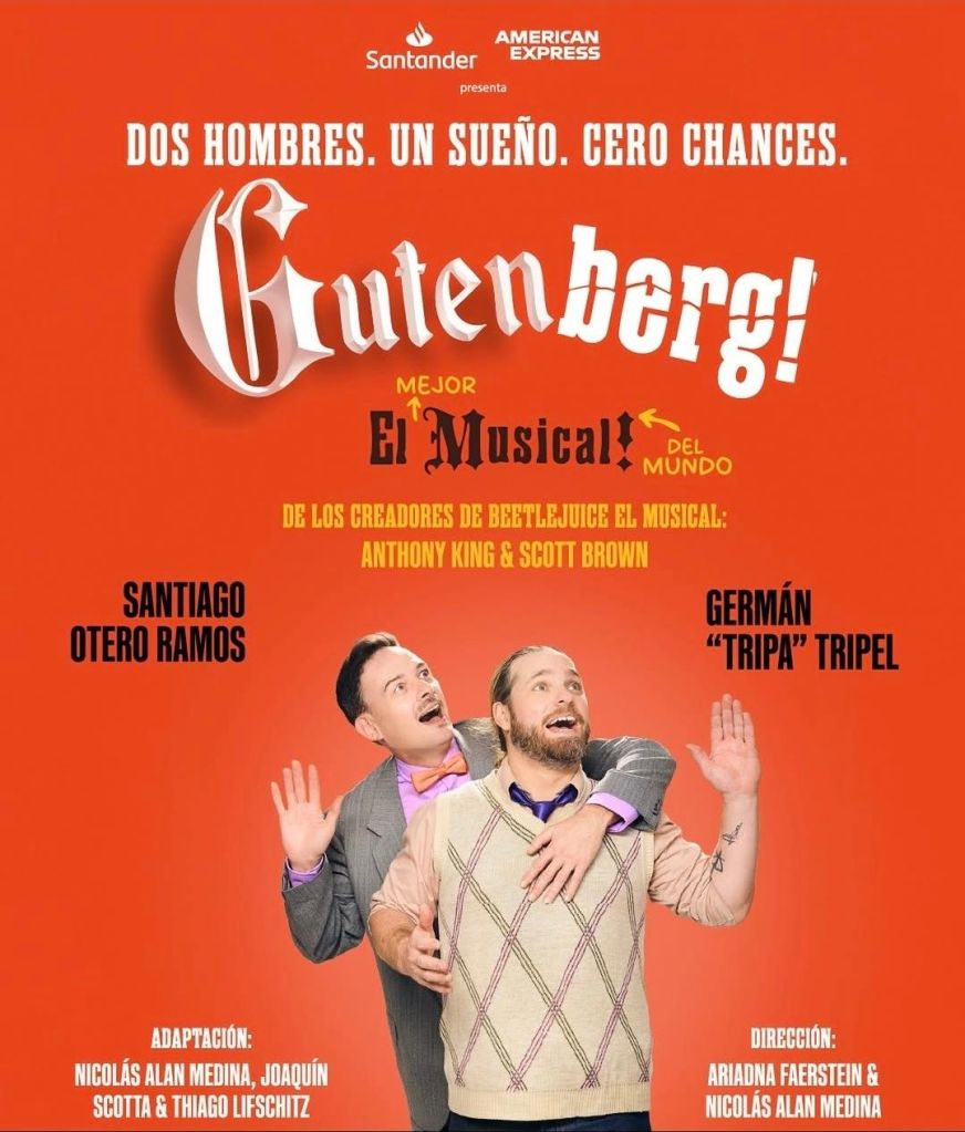 La versión argentina de «Gutenberg: El musical», basada en la obra de Scott Brown y Anthony King, ha llegado al Paseo La Plaza para robarse las risas del público. Protagonizada por Germán Tripel y Santiago Otero Ramos, esta comedia musical no solo es una adaptación, sino una sátira brillante sobre el propio género del teatro musical. La puesta en escena nos presenta una historia dentro de otra. Por un lado, vemos a dos soñadores escritores y compositores que, con la esperanza de ser contratados por un productor, han alquilado una sala de teatro para hacer una «lectura» de su próximo gran musical: una épica obra sobre la vida de Johannes Gutenberg. Lo interesante es que el público se convierte en ese potencial productor, rompiendo la cuarta pared de una forma muy divertida y haciéndonos sentir parte de la historia.