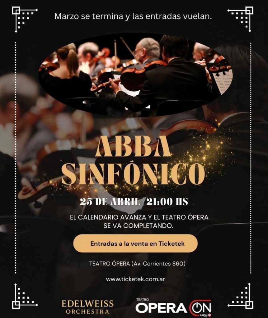 Edelweiss Orchestra llega a la ciudad de Buenos Aires con ABBA Sinfónico, un concierto que recorre los grandes clásicos del cuarteto sueco en formato sinfónico, con arreglos especialmente creados para vivir una experiencia emocionante y de alto impacto sonoro. La cita es el sábado 25 en el Teatro Opera On.