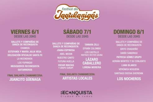Viernes 6 de Enero • Ballets y compañías de danza de Reconquista • Chamiza • Estefanía y María Julia Vega • Delegación Oficial de Santa Fe • La Incendiada • Los Yupanqui • Musiqueros Reconquista • Guitarreros • Final Bailanta Chamamecera: • Juancito Güenaga