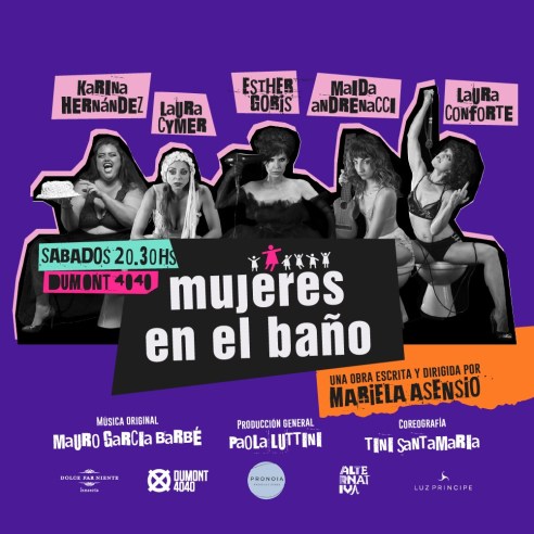 ¿Qué hacen tanto tiempo las mujeres en el baño? Esta famosa pregunta se usa como disparadora para abrirnos las puertas a un universo lleno de deseos, fantasías sexuales, cuestionamientos sociales, empoderamiento femenino, relatos apasionantes y canciones inesperadas, en donde la fusión entre el sueño y la realidad se tornan algo borrosa y confusa. Después de 15 años vuelve a escena “Mujeres en el baño”, una obra que expone con humor, ironía y mucho rock, el lado B de lo que implica ser mujer en el mundo actual. Creada y dirigida por Mariela Asensio, en esta nueva versión reúne un elenco de talentosas actrices: Esther Goris, Laura Cymer, Laura Conforte, Maida Andrenacci y Karina Hernández. Éstas mujeres los y las esperan todos los sábados a las 20:30 hs en el teatro Dumont sobre la calle Santos Dumont 4040, en el barrio de Chacarita.