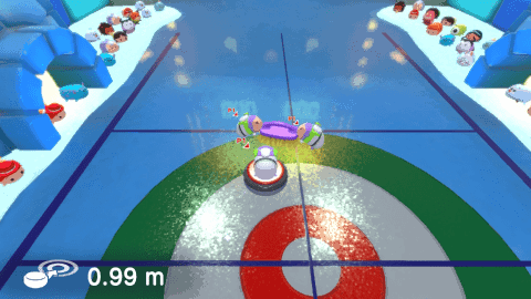 Cada vez que tiramos un disco elegimos la fuerza de lanzamiento y podemos ajustar la dirección durante el lanzamiento. También hay que barrer el hielo para no perder la fuerza y velocidad del mismo.